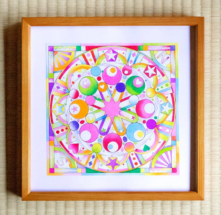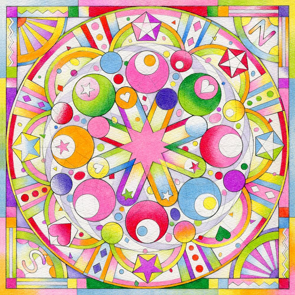 コンパスやテンプレートでリズミカルに描いたドローイングに色鉛筆で着彩したアートワークです。