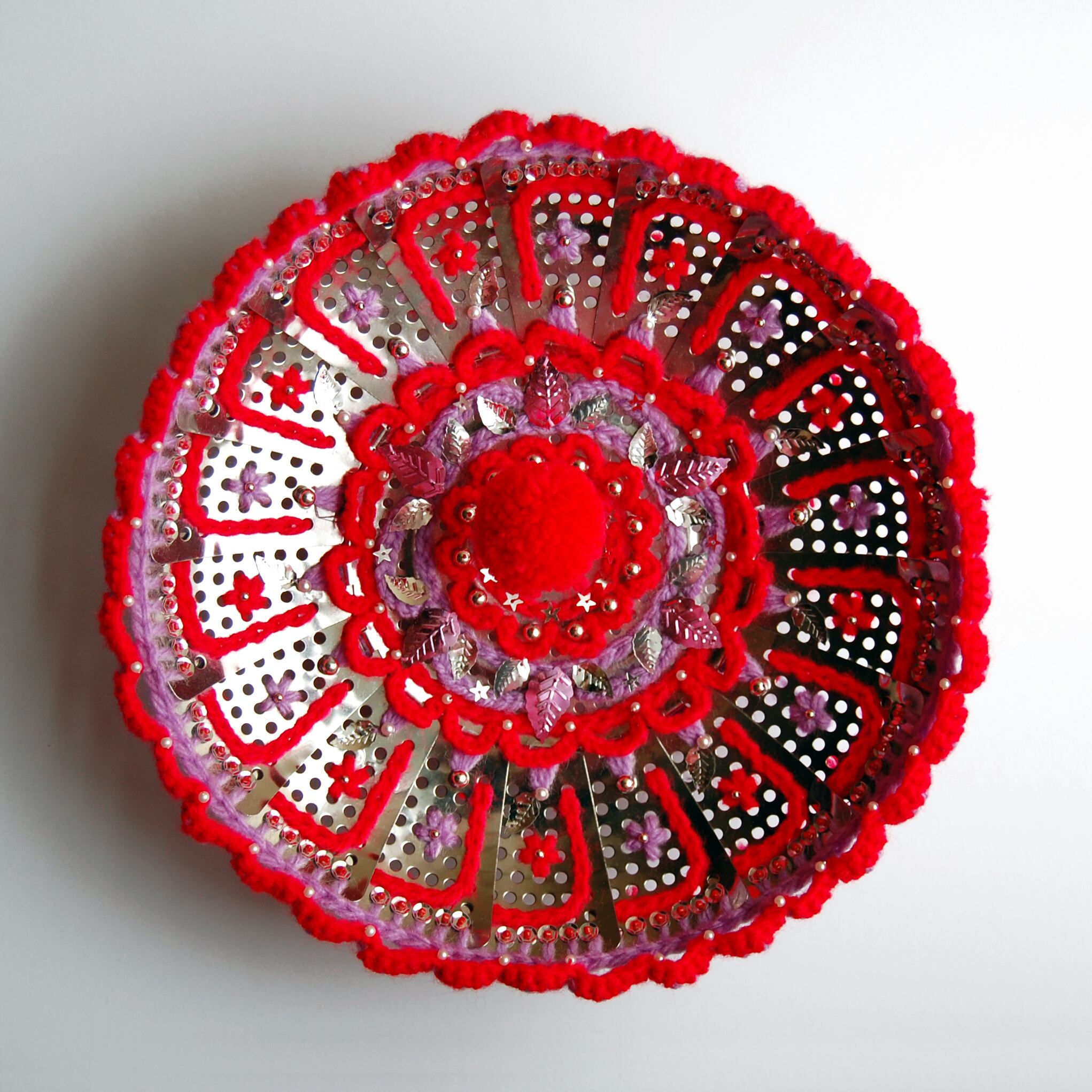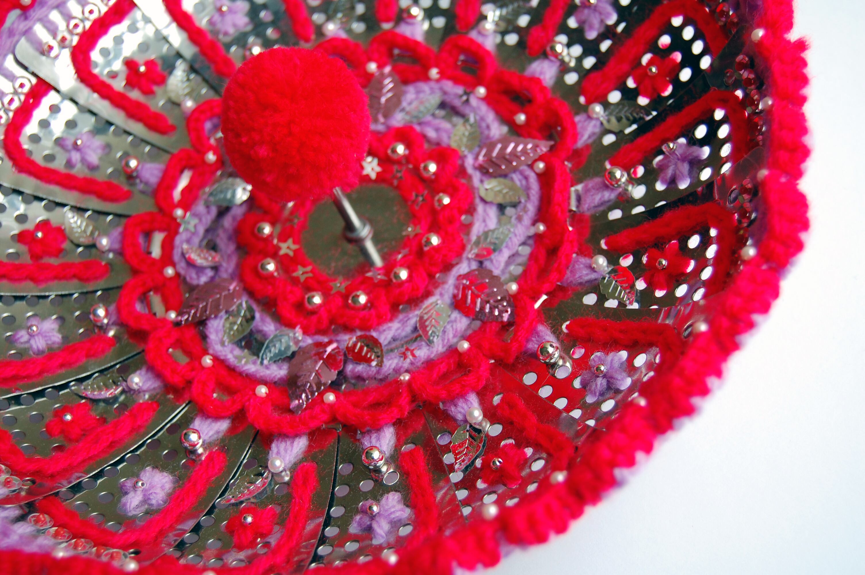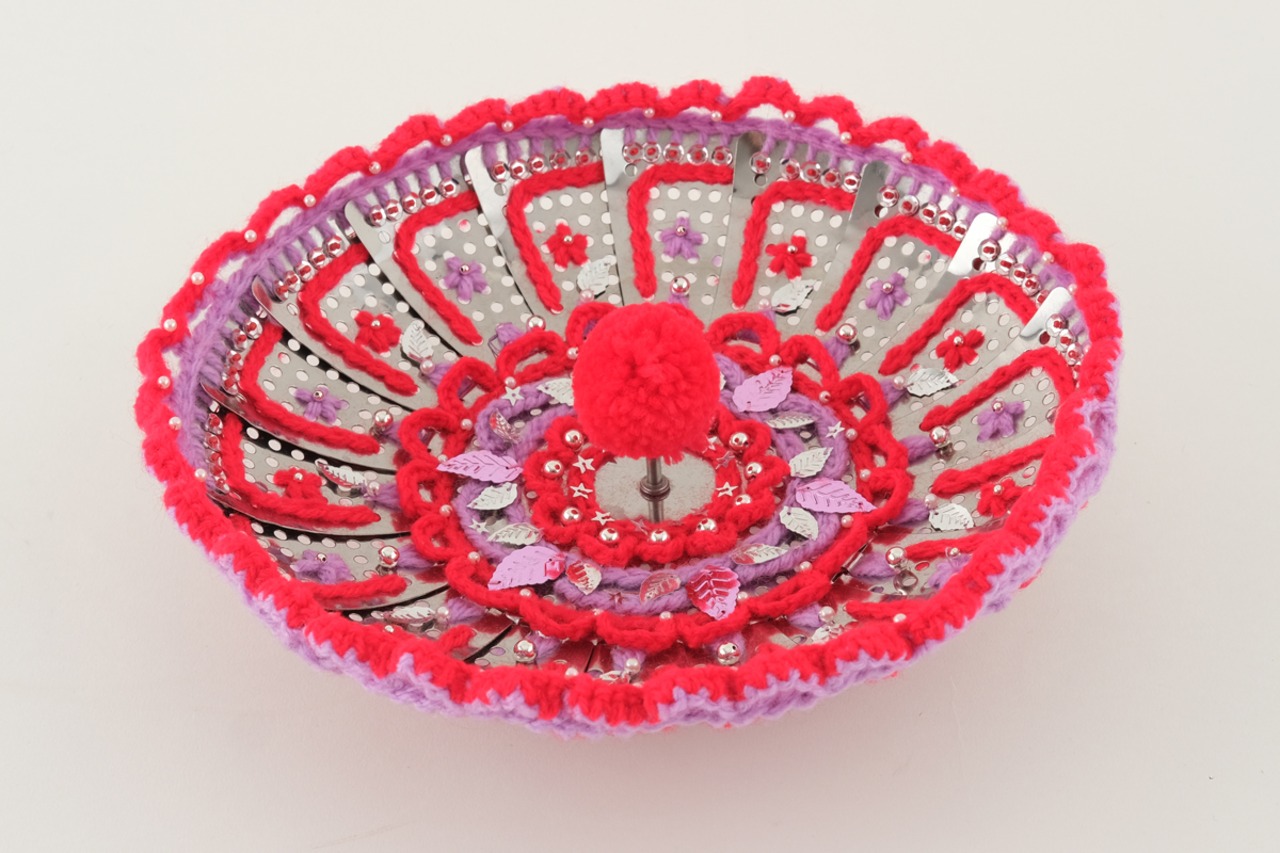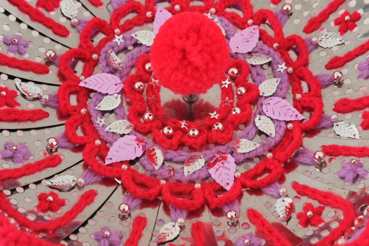 蒸し器をアクリル毛糸とビーズで装飾しています。
